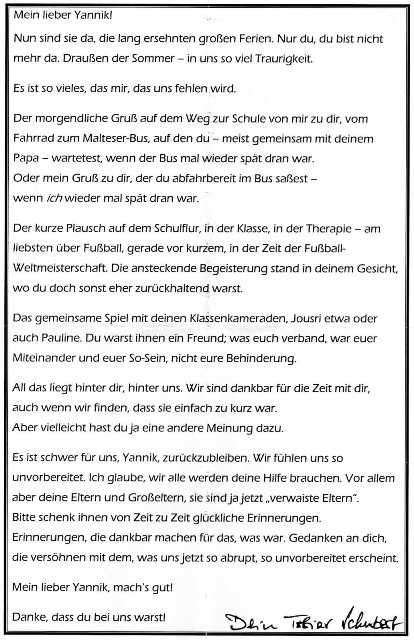 Noch viele Wochen später riss die Flut der Trauerpost nicht ab – unzählige liebe Zeilen drückten Mitleid und gute Wünsche aus – es hat natürlich immer aufs neue sehr aufgewühlt und weh getan diese Worte zu lesen, aber es hat auch immer getröstet zu wissen, wie Yannik von seiner Umwelt wahrgenommen wurde und das er von vielen Seiten bewundert wurde, wie er mit seiner Krankheit umgegangen ist … und wie sehr er schon jetzt vermisst wird.